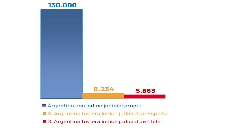 Si Argentina tuviera el índice judicial de España, tendría algo más de 8000 juicios por año y si tuviera el índice de Chile no alcanzaría a 6.000 juicios por año.