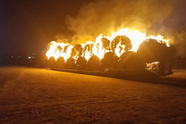 Se incendio un acoplado con rollos de alfalfa en Ruta Nacional 12