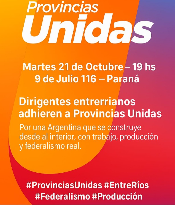 El próximo martes 21 de octubre, a las 19 horas, en 9 de Julio 116, Paraná, se realizará un encuentro donde dirigentes, legisladores y referentes entrerrianos expresarán su adhesión al espacio Provincias Unidas, una construcción política y federal que busca fortalecer la voz del interior en el debate nacional.