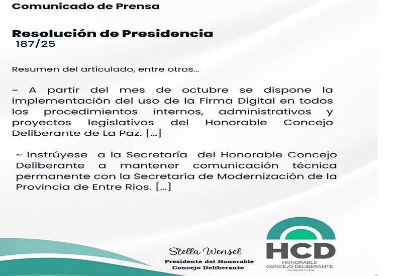 La Presidencia del Honorable Concejo Deliberante de La Paz emitió la Resolución N° 187/25, mediante la cual se busca modernizar los procedimientos administrativos y legislativos del cuerpo. Esta iniciativa tiene como objetivo optimizar los procesos internos, fortalecer la transparencia institucional y facilitar el acceso a la información pública.