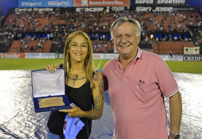 En la previa del encuentro de la Liga Profesional de Fútbol en la capital provincial, entre Patronato y Godoy Cruz, el secretario de Deportes, José Gómez, hizo entrega de una plaqueta a la pugilista de 33 años, que recibió la ovación de los presentes.